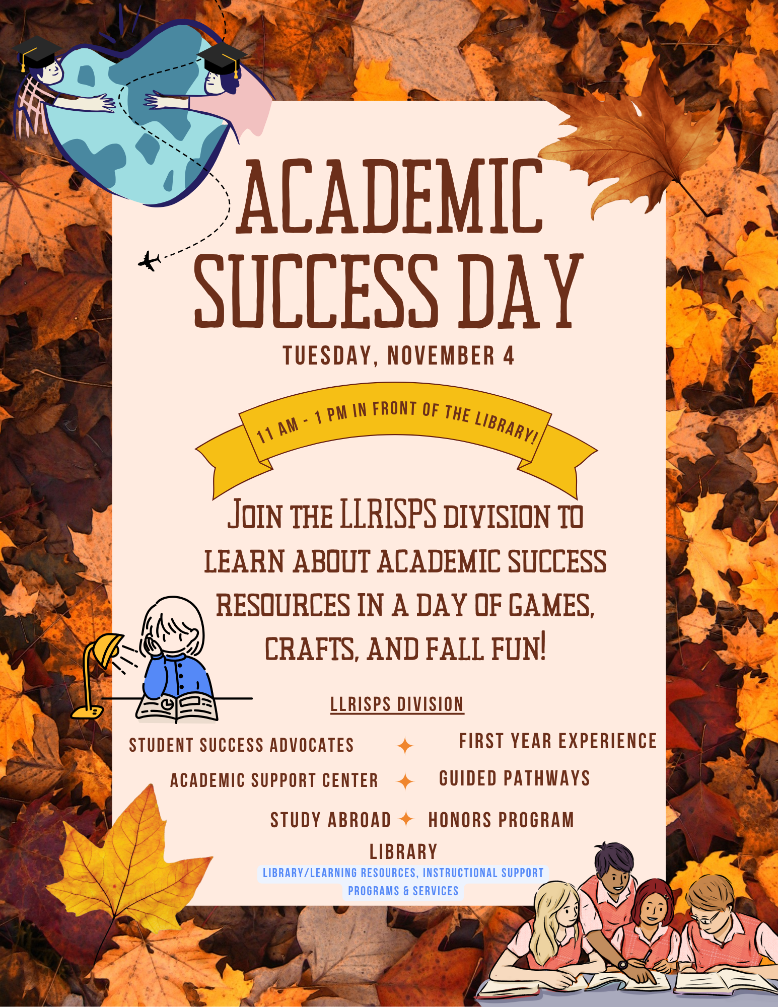 Join the LLRISPS division to learn about academic success resources in a day of games, crafts, and fall fun on Tue, November 4 from 11 a.m. to 1 p.m. in the Quad!