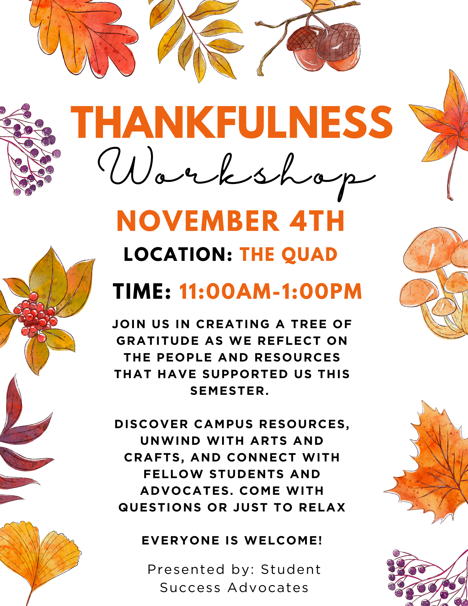 Join us in creating a tree of gratitude as we reflect on the people and resources that have supported us this semester. Discover campus resources, unwind with arts and crafts, and come relax with us! Tuesday, November 4 from 11 a.m. to 1 p.m. in the quad!