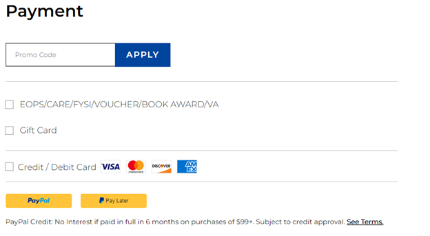 Select the box that reads “accept terms”. Click the box that applies the appropriate payment account. Make sure to apply payment AND click the accept term box. It will not ask for a credit card, unless the balance owed is more than the allotted amount or an item isn’t covered by the award.
